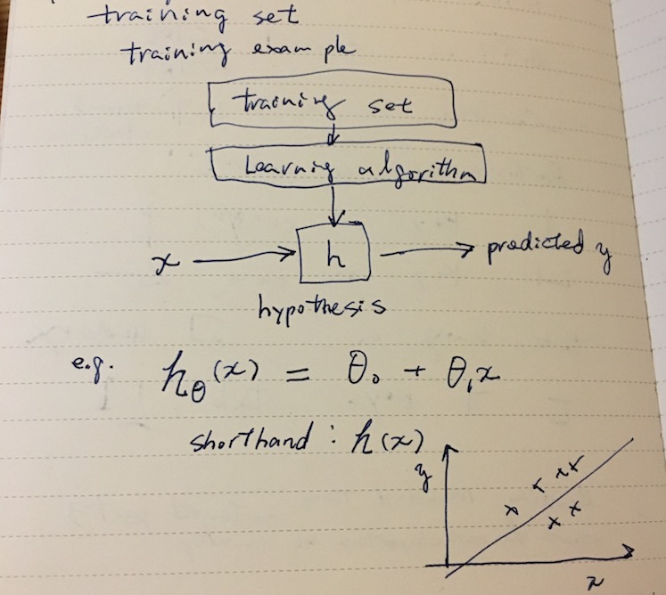 Supervised learning can be modeled as a process of coming up with a good function h called hypothesis that predicts y from an unknown x.