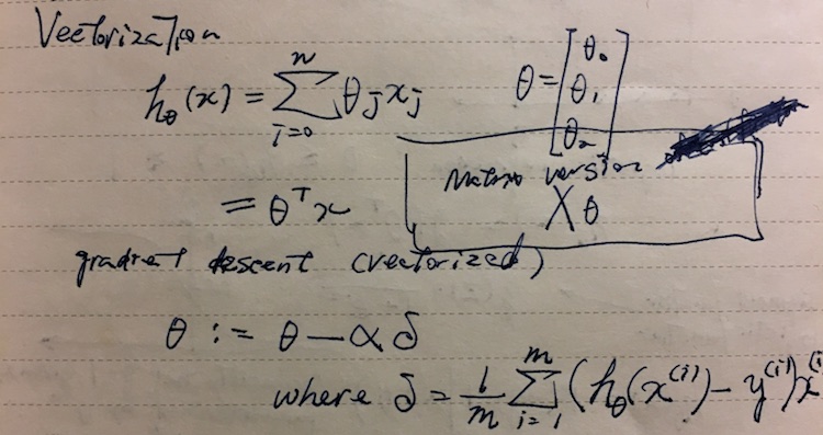 When implementing learning algorithms, avoid using for-loops and try to use vector and matrix multiplications. Generally the process of refactoring to use vector is called vectorization.
