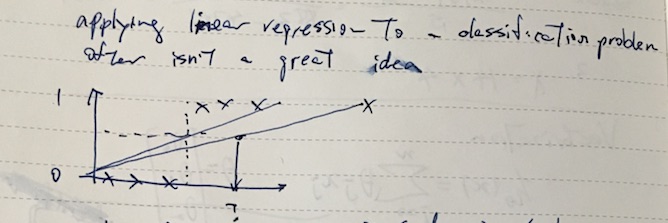 One might try to apply linear regression to classfication problem by saying y = 1 when hθ(x) >= 0.5, but apparently it’s not such a good idea.
