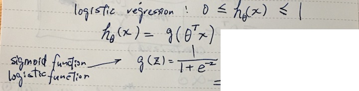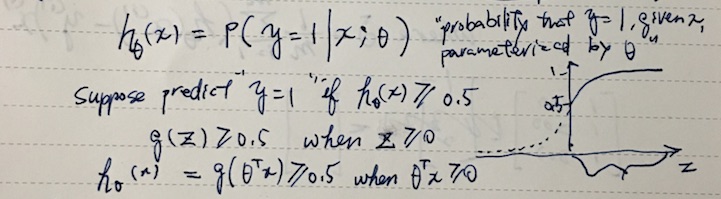 By plugging θTx into logistic function g(z) that gives sigmoid curve, we can turn real values into 0, 1 signal. When z == 0, g(z) returns 0.5. Another way of thinking about this is that hθ(x) will now give us the probability that y = 1.