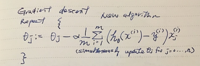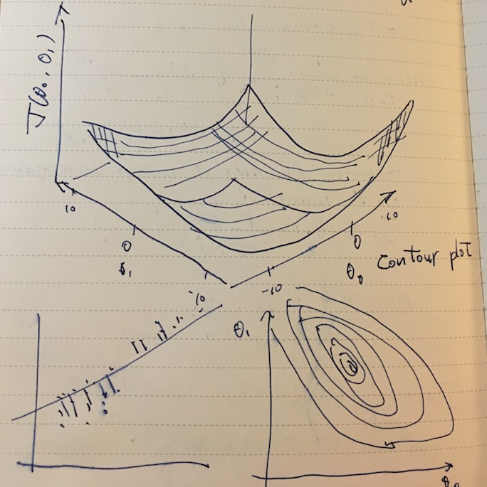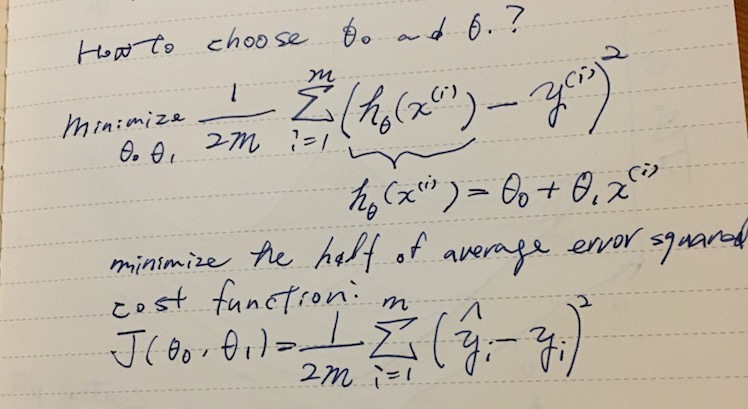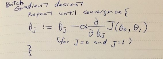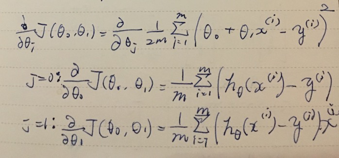 Given a hypothesis and its cost function, we can try to find the parameters that fits the data. One of the methods is gradient descent. In gradient descent, the parameters θ0, θ1 are incrementally changed to lower the cost. It turns out that we can determine the direction of walking by taking the partial derivative of J(θ) by θj and multipiled by some learning rate α (η eta is used in textbooks).
