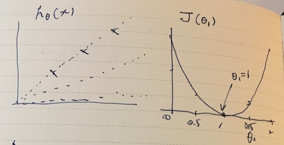 Let’s say a hypothesis is hθ(x) = θ0 x. Depending on the value we put into θ0, it could take different slopes as shown below. To get the intuition for the curve fitting, we can plot the cost function J(θ) against θ.