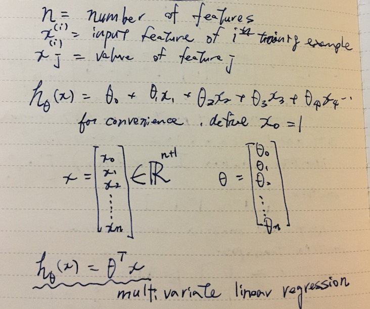Using vectors θ and x, we can seamlessly build up on dimensions. The trick to express the whole thing as a vector multiplication is to hardcode x0 to 1.