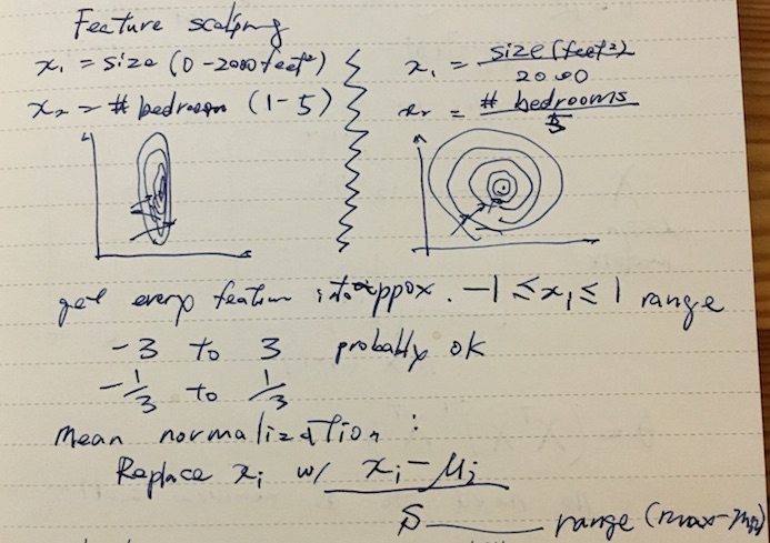 When using gradient descent, it’s important get all the features in the similar scale so the algorithm won’t overshoot. The convention is to get them in the neighborhood of -1 to 1 range, but -3 ~ 3 is considered ok.